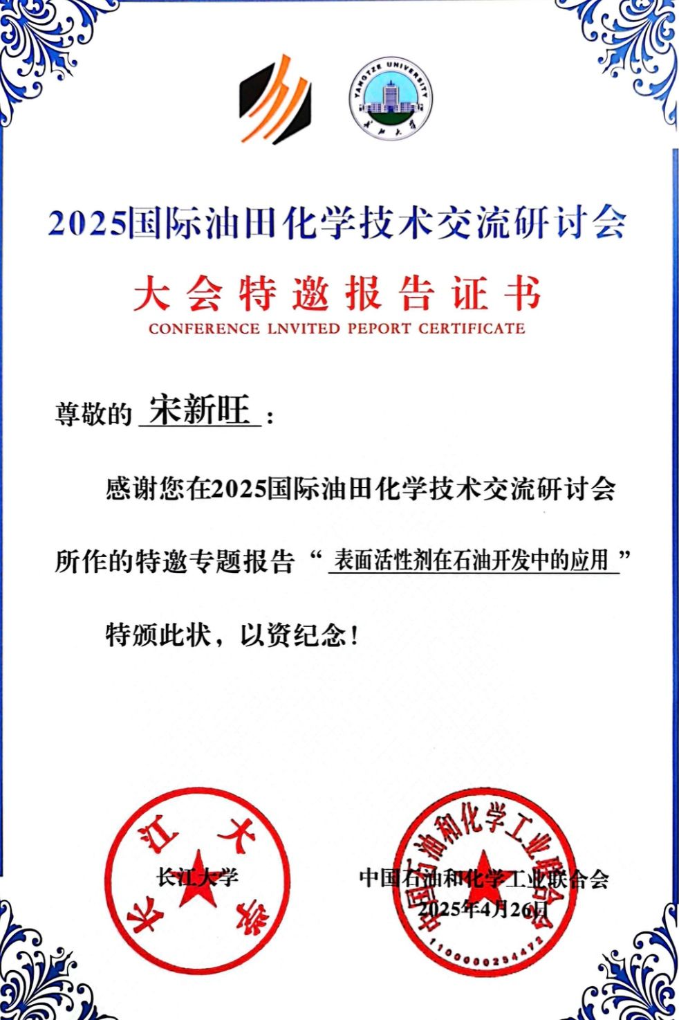 2025年4月26-27日,化学工程学院宋新旺教授参加了由中国石油和化学工业联合会和长江大学主办的“2025国际油田化学技术交流研讨会”,并作特邀专题报告“表面活性剂在石油开采中的应用”,介绍了永利23411集团在采油用表面活性剂方向的最新研究成果,受到与会人员的高度关注。