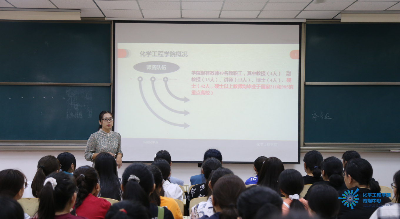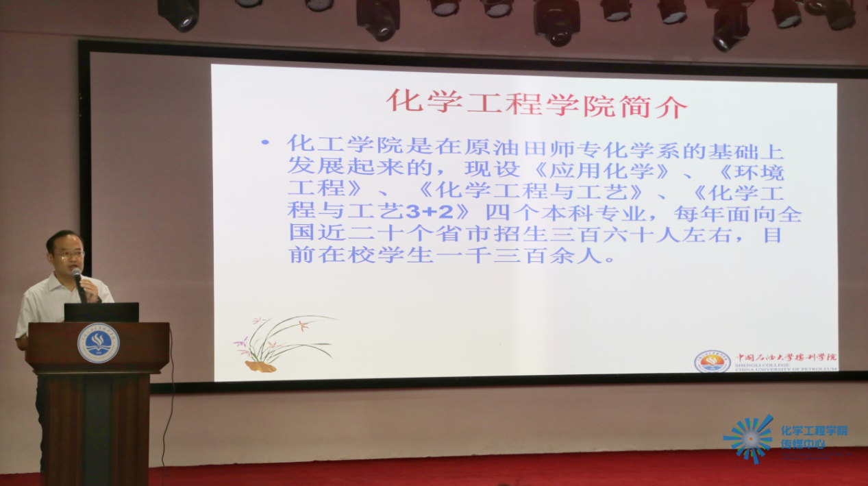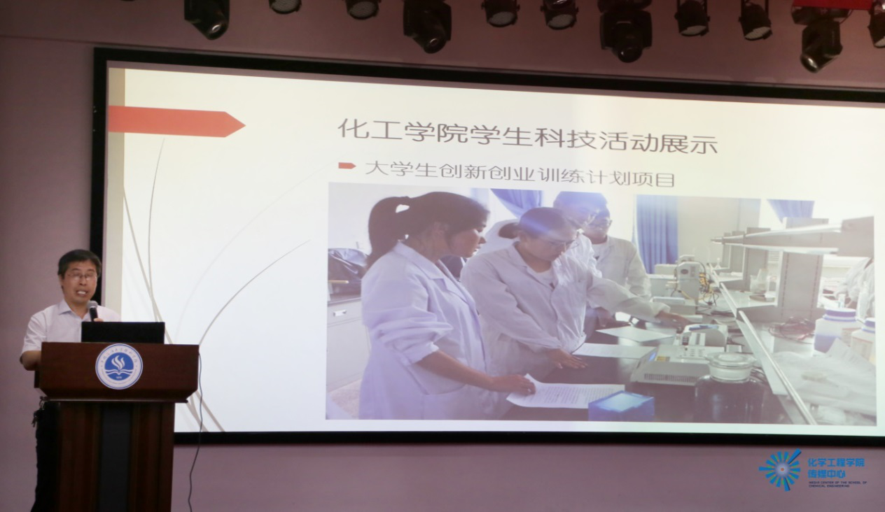 接下来,副院长史德青从“带你了解校园和化学工程学院”开始,让新生们更好地了解学院环境以及向新生们展示了创新创业实验室、大学生创业训练计划项目等,展示了化学工程学院学生科技成果。