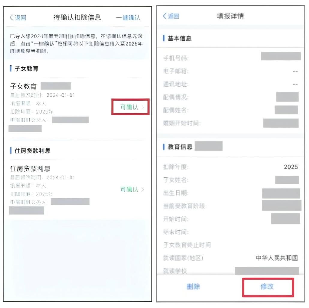 若需要修改、删除以前填报的专项附加扣除信息,可以在“专项附加扣除信息确认”页面进行【修改】或【删除】。