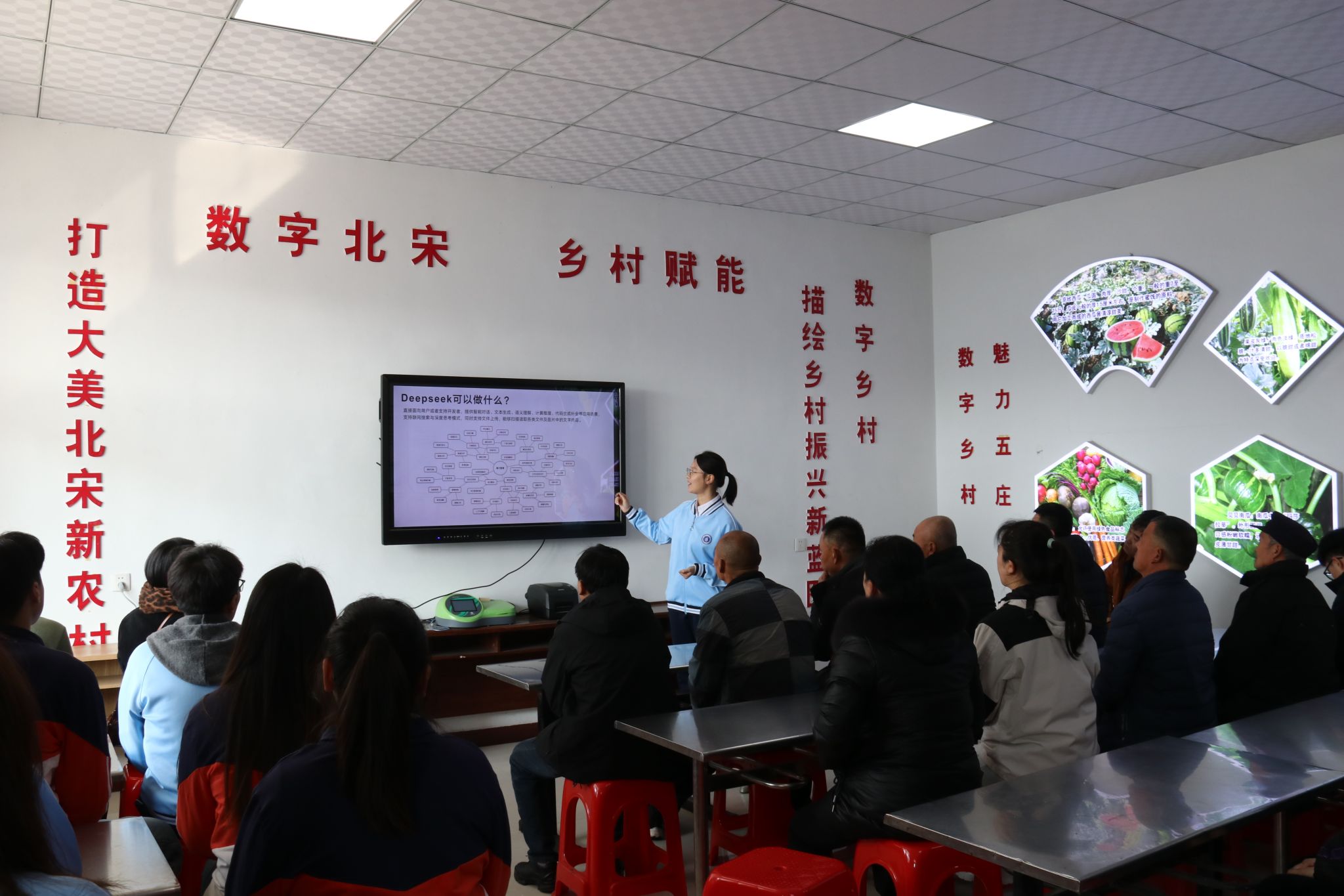 在北宋镇五庄村党群服务中心,学生党员们胸带闪耀的党徽,怀着无比崇敬的心情,参加了庄严的升旗仪式。升旗仪式结束后,全体党员认真学习了《中共中央国务院关于进一步深化农村改革 扎实推进乡村全面振兴的意见》,并围绕“如何发挥高校职能,助力乡村振兴”这一主题,两党支部进行了深入的交流。随后,学院学生以DeepSeek本地化部署为契机,向农村群众详细介绍了人工智能技术在农业生产生活中的应用,在现场指导群众安装软件,向他们讲解如何借助人工智能技术解决当前作物种植过程中遇到的问题。