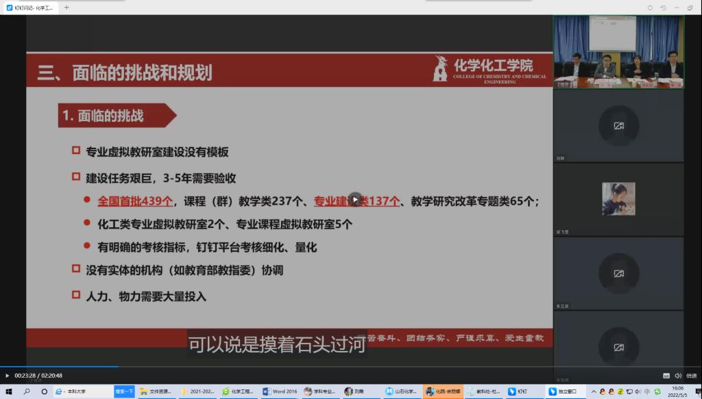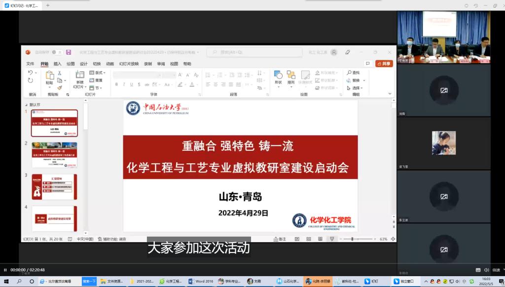 4月29日上午,虚拟教研室建设试点启动大会在中国石油大学(华东)化学化工学院以线上线下结合的方式举行。中国石油大学(华东)副校长周鹏教授、教育部高等学校化工类专业教学指导委员会秘书长夏淑倩教授、化学化工学院院长刘欣梅教授等领导、14所高校成员单位领导及教师代表参加了会议。永利23411集团5名教师通过线上平台全程参加了会议。