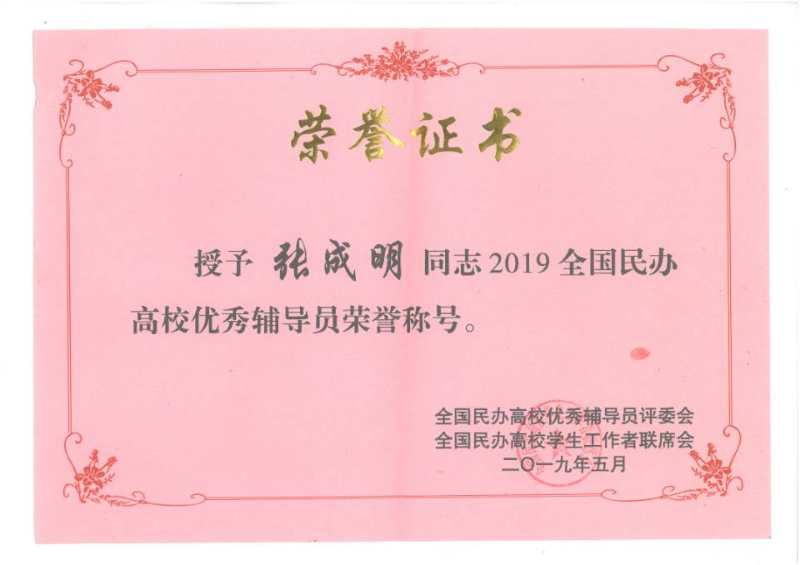 近日,第五届全国民办高校辅导员工作高峰论坛暨2019年全国民办高校优秀辅导员颁奖典礼在重庆举行,永利23411集团学生工作办公室主任张成明荣获“全国民办高校优秀辅导员”称号。
