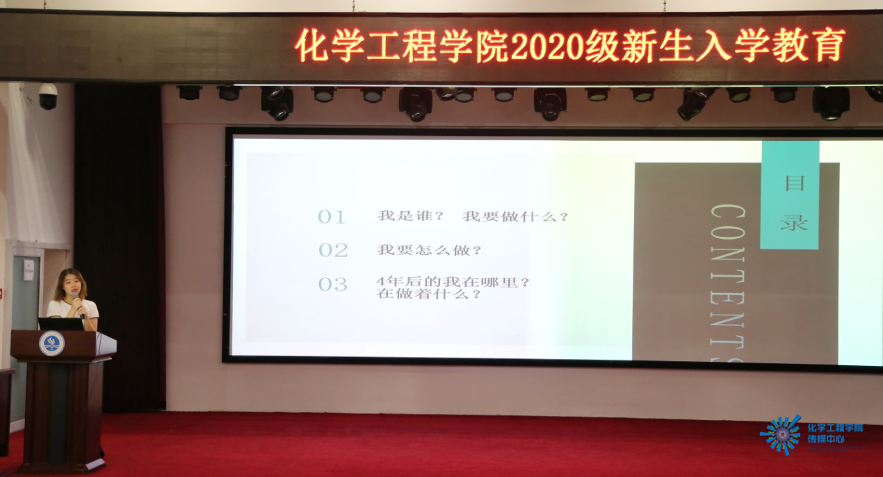 接下来,副院长史德青从“带你了解校园和化学工程学院”开始,让新生们更好地了解学院环境以及向新生们展示了创新创业实验室、大学生创业训练计划项目等,展示了化学工程学院学生科技成果。