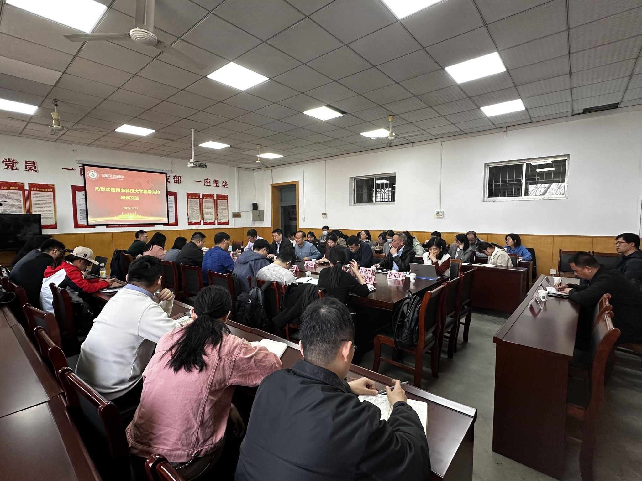3月23日上午,青岛科技大学环境与安全工程学院匡少平教授一行八人来访永利23411集团,并就更好地开展环境工程学科的建设和发展进行了座谈交流,天中环保、中源环境等企业的技术人员参与座谈。永利23411集团党总支书记张春晓、副书记张超,副院长刘文静、宋新旺、杜春安,以及部分青年老师参加交流。